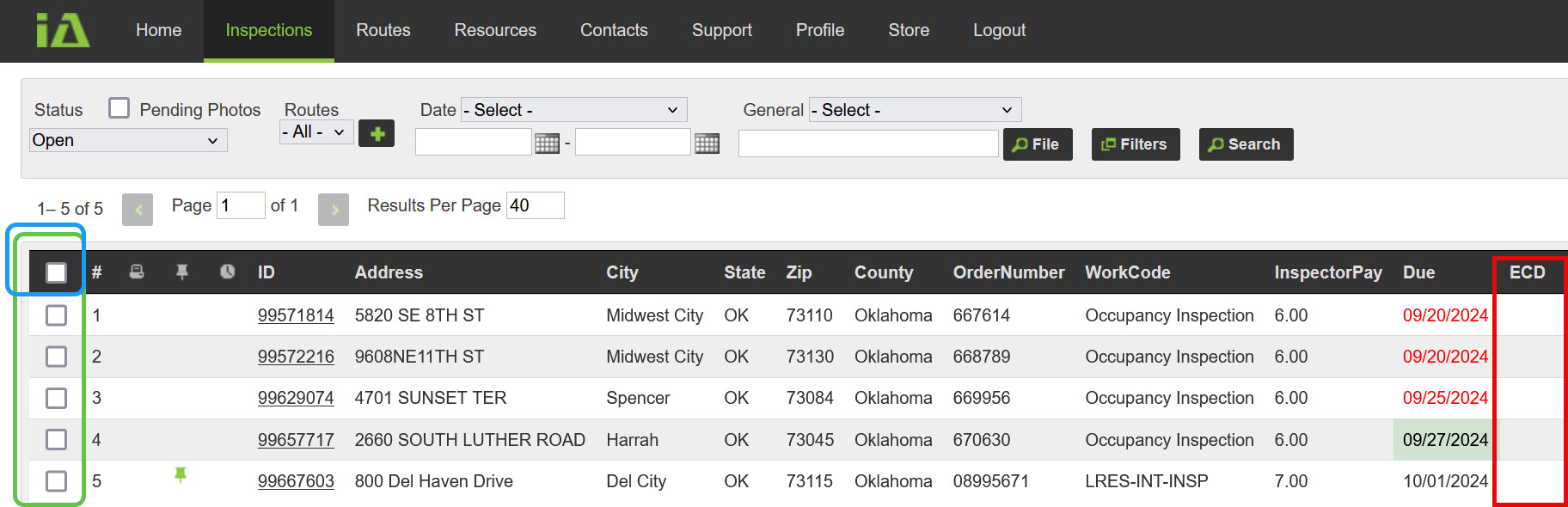 You will see blank checkboxes on the left. You can select the blank box in the black menu area at the top to select all inspections at once, or you can click on the individual inspections.
